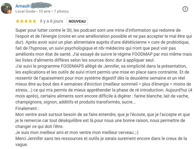 Ce protocole n'est pas une énième méthode vendue comme "miracle". Bien sûr, je n'ai aucune garantie que ça puisse marcher sur vous, alors le meilleur des arguments que j'ai trouvé, c'est le témoignage de mon client Arnault qui avait tout essayé (même le régime FODMAP avec diététicienne !!) et pour qui rien n'a fonctionné sauf... Le protocole FODMAP allégé®. Vous pouvez écouter son témoignage en cliquant ici.